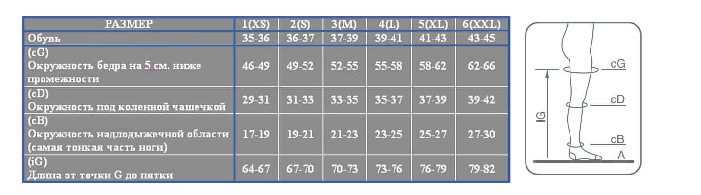 В области щиколотки и голеностопного сустава компрессия составляет 100%, ниже коленного сустава компрессия уже 70%, а в верхней трети бедра — не более 40% от начального значения.